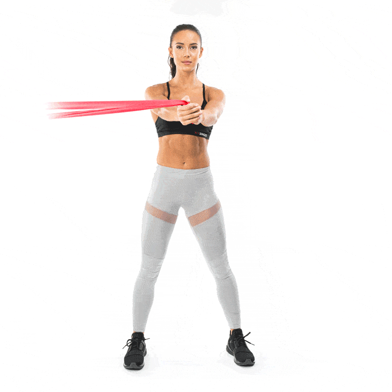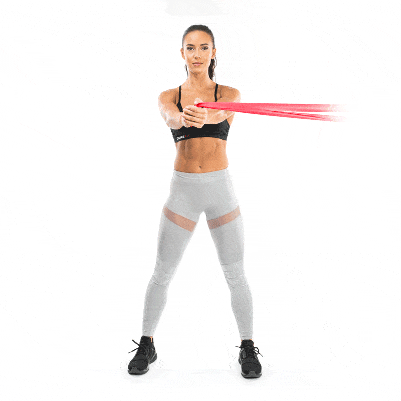 Description: Anchor the band to the left side of the body and stand upright; grasp the band out in front of your body with both hands; holding this stabilized position, rotate to the right side and return centre.