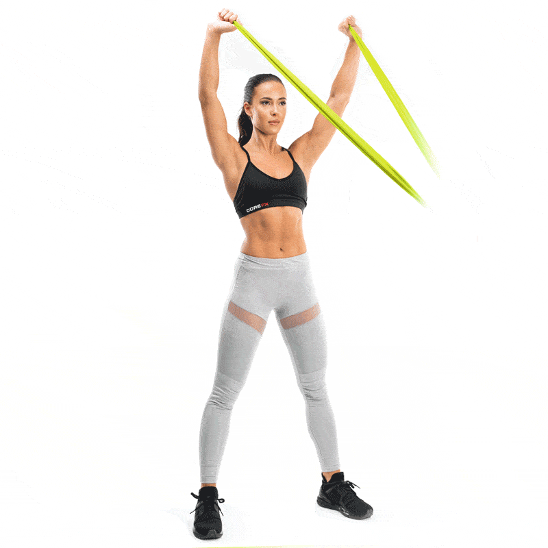 Description: Lay on your back, feet hip-width apart, with the band anchored overhead; grasp the band with your hands about a foot above your head, and your hands positioned just beyond the top of your head; maintaining straight arms, pull the band toward your thighs; return to start and repeat.