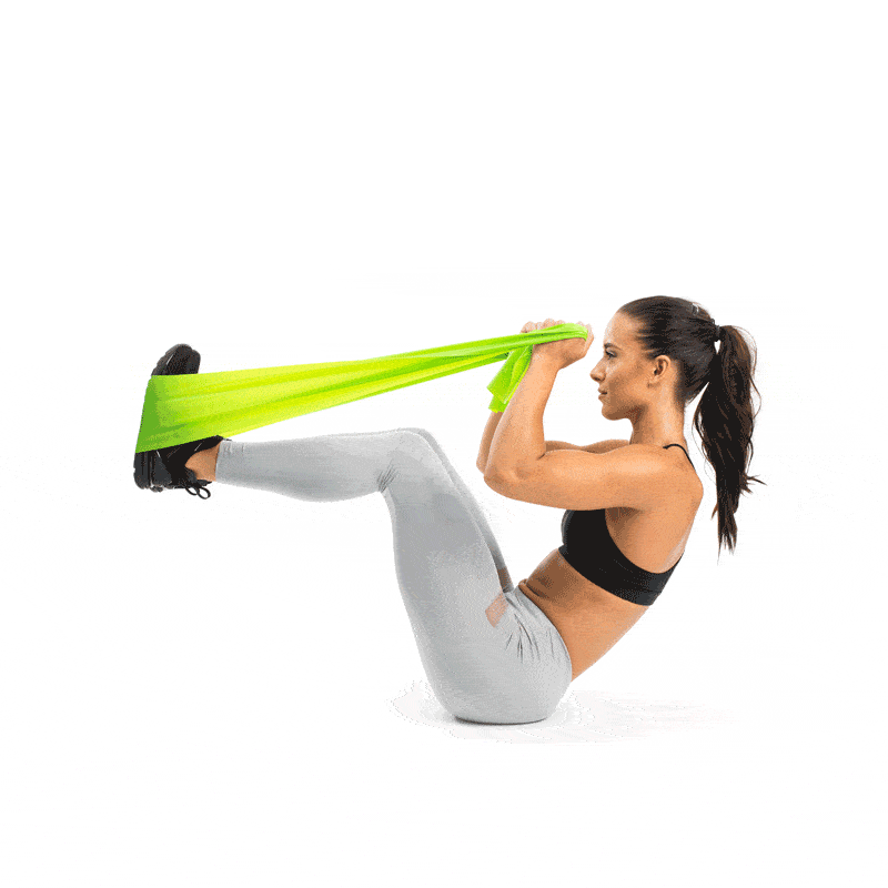 Description: Start in a v-sit with the band wrapped around the bottoms of your feet, knees and hips flexed/bent and holding the band with your elbows flexed 90-degrees; simultaneously straighten your legs by extending your hips and knees, while straightening your arms and flexing the shoulders by raising your hands overhead; return to start and repeat.
