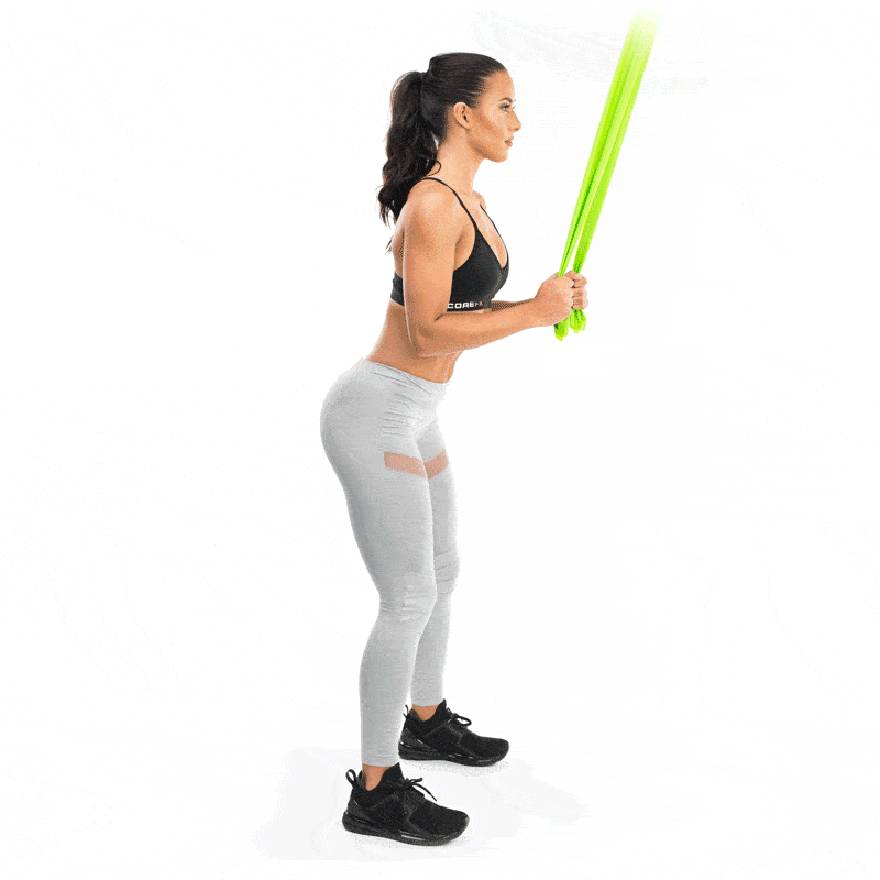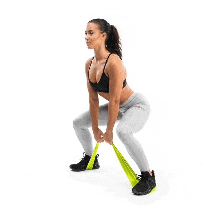 Description: Start in a static squat position with your band securely anchored under both feet and hands, while grasping the middle of the band; holding this static and somewhat upright and stabilized position, pull the band upwards toward your chest; return to start and repeat, while maintaining the squat start position.