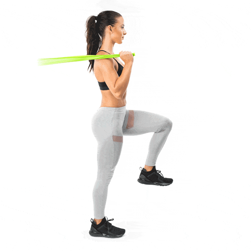Coach’s Tip: Though predominantly hip-centric, the hip lift is also a great exercise to activate the posterior chain (back side) of your upper body. This occurs as you lift your hips and press your arms into the floor. The hip lift helps to prep your lower and upper body for any type of workout. Be sure to push your hips as high as possible—use your glutes—but also keep the core engaged throughout the movement. Make the exercise harder by using a heavier band or pressing harder into the floor.