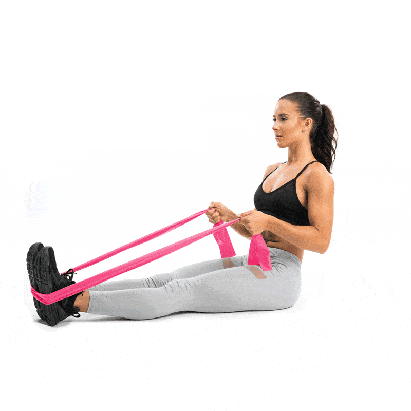 Description: Start in a seated position, feet together, with the band anchored securely around your feet; grasp the band with each hand, shoulder width apart; place your arms close to the sides of your torso and keep them flexed/bent 90-degrees; maintaining the start position posture, press your arms straight to full extension and slightly behind your hips; return to start and repeat