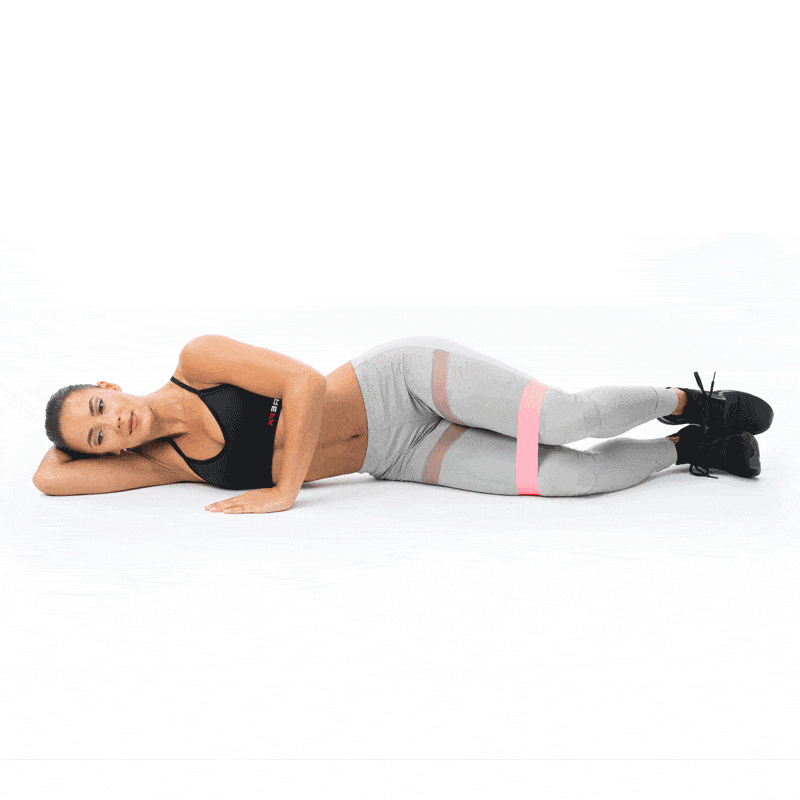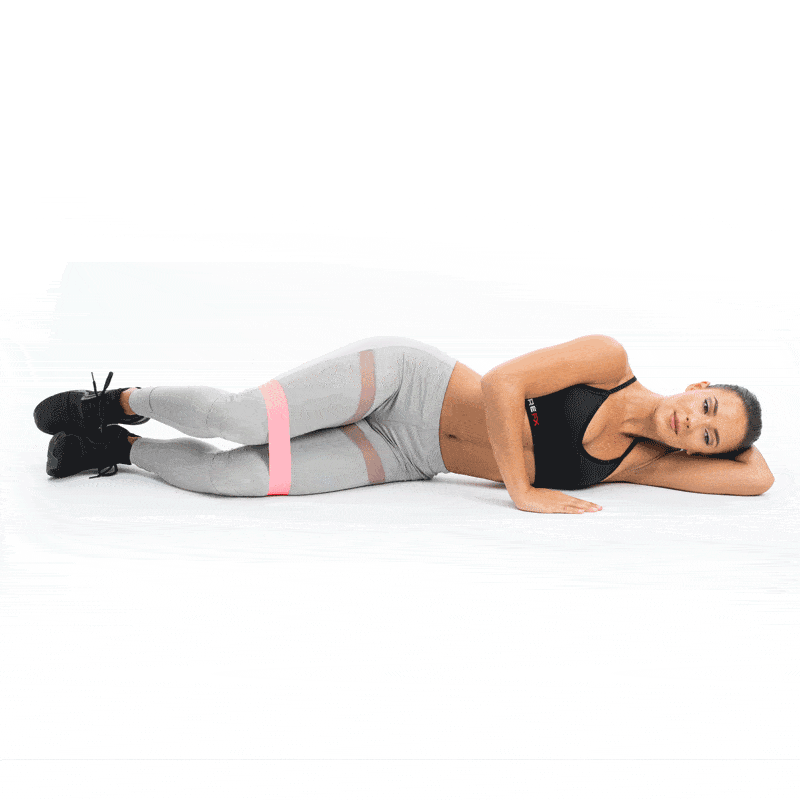 Description: In a sidelying position place the band just above your knees with your left arm under your head and your right top arm resting on the floor with the elbow bent 90-degrees; keep the knees and hips slight flexed (a little bend) and the hips in line with your shoulders; maintain this stabilized start position as you externally rotate your upper leg by moving your right knee toward the ceiling; keep your feet in contact with one another and don’t open your hips (belly facing the ceiling).