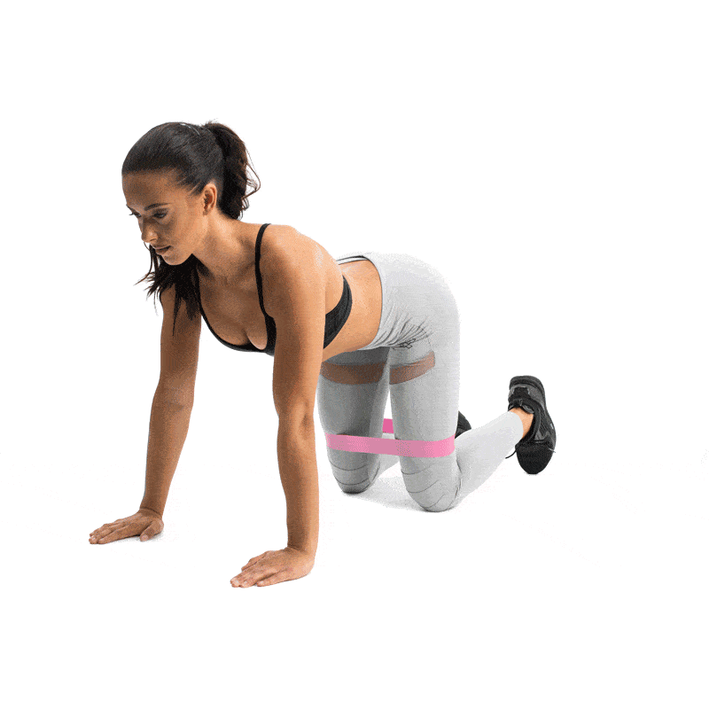 Description: Position yourself in a quadruped or “all-4s” position. Place your hands under your shoulders and position your hips over your knees. The band should be placed around your thighs about half way up the upper leg. Fix your gaze directly into the ground. Abduct or lift your left leg about 45 degrees – moving it away from the midline or center of your body. After reaching your desired range of motion, return to the start and repeat.