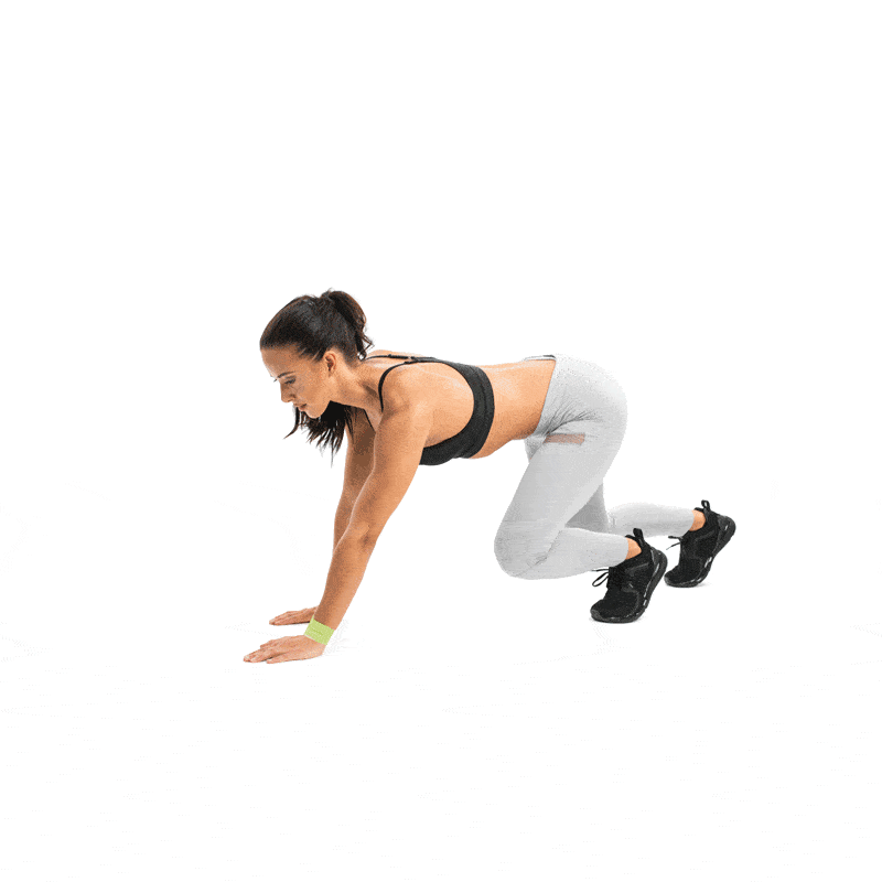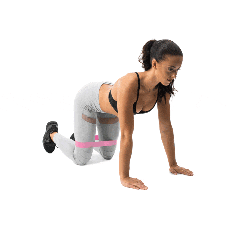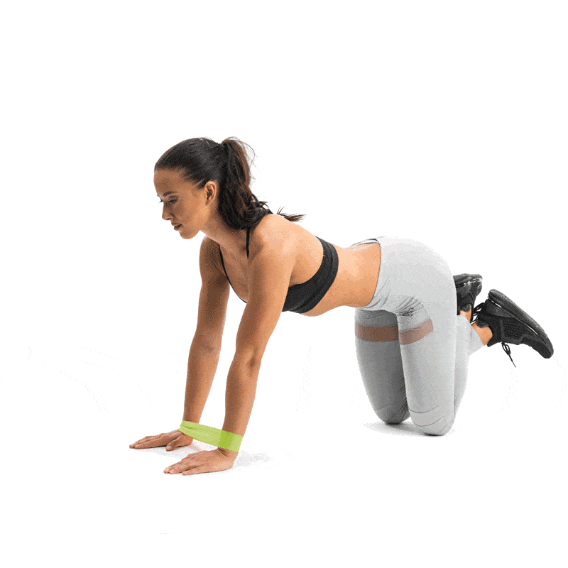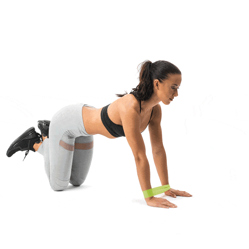 Description: Begin by kneeling on all-fours, with your band around both wrists; press up with only your hands and feet in contact with the floor and your same side arm and foot leading the movement; alternately lead with your same side arm and leg (R/R; L/L) and advance across the floor in a Bear Crawl motion