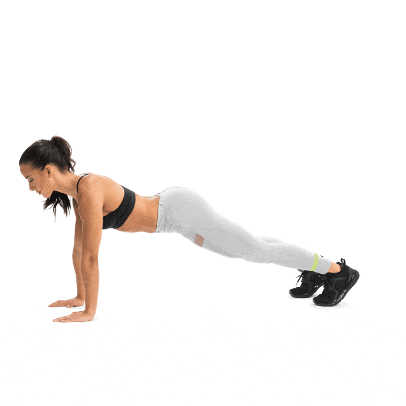Coach’s Tip: This upper body stabilization and metabolic exercise targets your core, torso and arms as the legs alternately move forward and back, as well as increasing your heart rate and calorie burn. Maintain body alignment by not letting your hips drop or your butt lift. Keep the toes of your driving leg pulling towards your shin to keep the band in place. Make the exercise harder by using a heavier band.