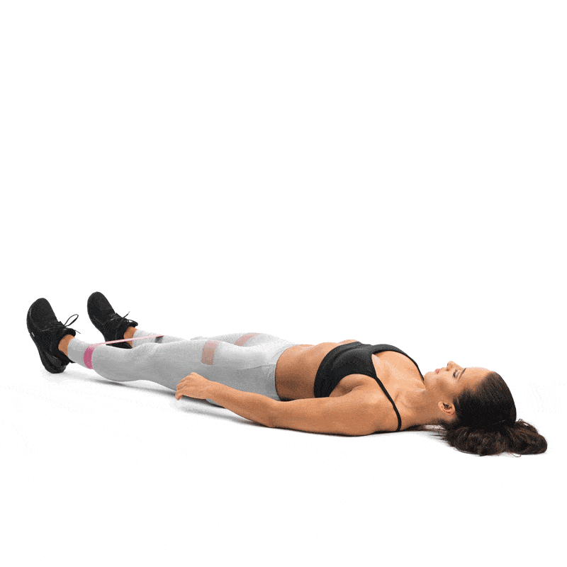 Description: Start on your back (supine) with the band placed just above your ankles and your arms by your side. Keep your CORE braced and spine lengthened throughout the exercise. Begin by bending at the hips and moving into a “V” shape, which results from bringing your lower and upper body close together. Simultaneously, reach your hands between your legs as you form your “V.” Slowly return to the start position and repeat.
