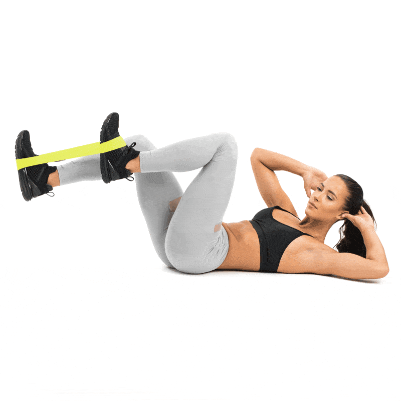 Description: Start on your back in an upside-down tabletop position with the band around the top of your feet and arch area. Keep your legs slightly apart to create tension on the band. Maintain a tight, braced CORE, with your hands behind your head. Begin by drawing your right elbow and left knee toward each other and repeat the movement in an alternating—right/left; left/right—rhythmic fashion.