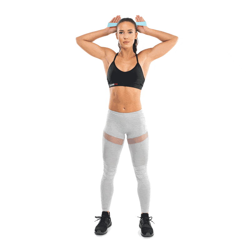 Description: From an upright stance, place the band around your wrists and position your hands (palms forward) behind your head; your elbows are flexed and above shoulder height; brace/tighten your core and move your hands apart by driving your elbows out and down toward the sides of your torso, forming a W position (upper arms parallel to the floor and the wrists over the elbows); return to the start position and repeat