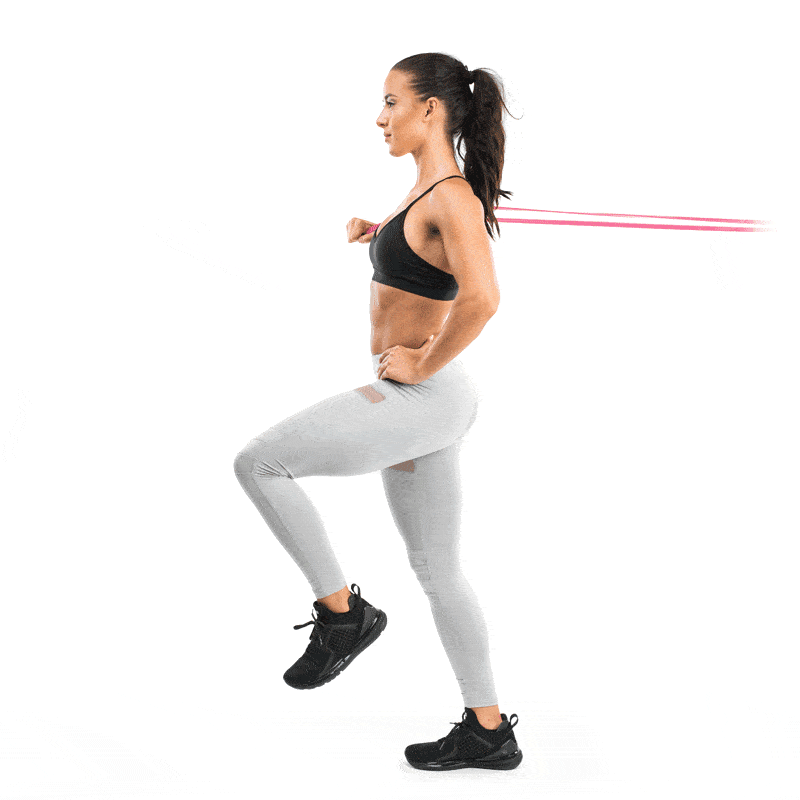 Description: Anchor the band at shoulder height, face away from your anchor point, and grasp the band in your left hand; while standing on your left leg, pull your other knee up until your thigh is parallel to the floor; maintain alignment and balance while extending your arm and pushing your hand away from the torso.