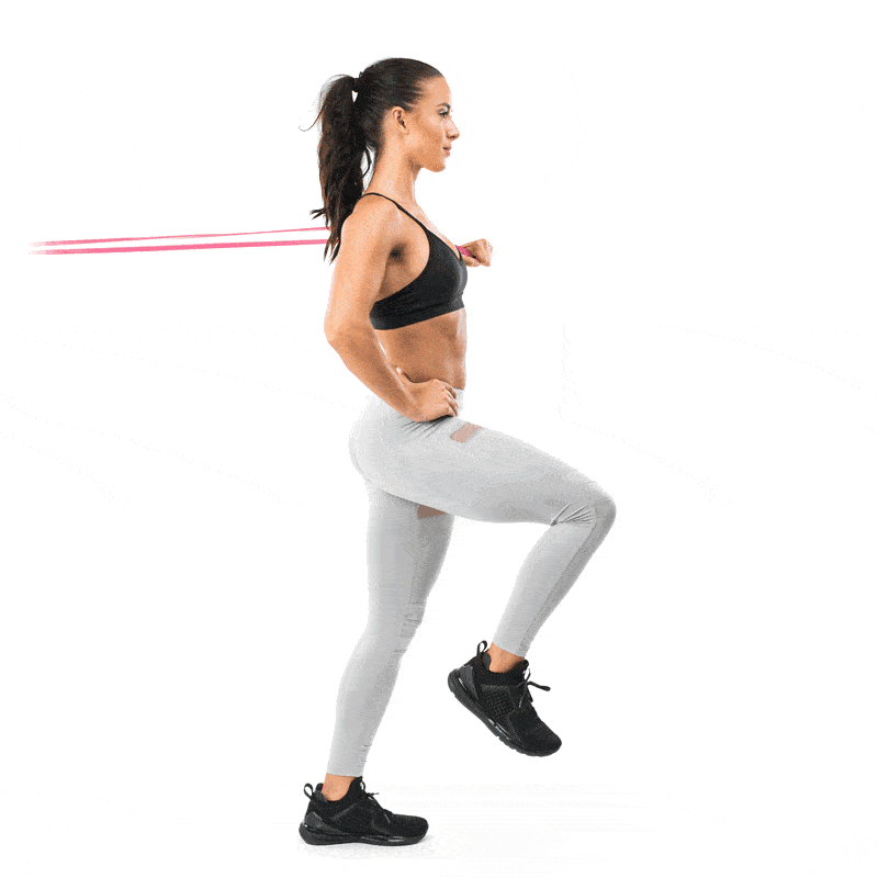 Description: Anchor your band at shoulder height, in front of your body, and grasp the band; while standing on your right leg, pull the other knee up until your thigh is parallel to the floor; maintain alignment and balance while flexing your arm and pulling your hand toward the chest.