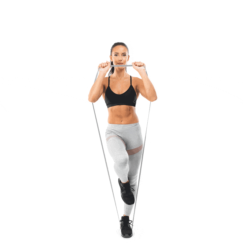 Description: Anchor the band under your feet using a shoulder width stance; grasp the band and position your hands at shoulder height; keeping the legs straight and core tight, press your hands overhead in a smooth motion.