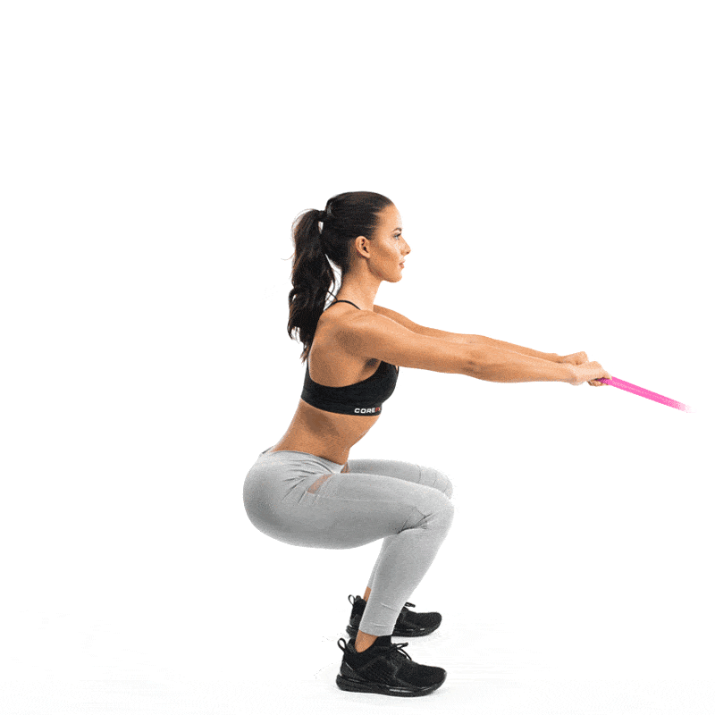 Description: Anchor the band in front of your body; holding the band, push your hips back and lower to a depth of thighs parallel to the floor with arms extended out in front of the body; return to a standing position and simultaneously pull your hands toward the chest.
